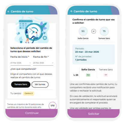 Desde la app, los empleados pueden solicitar un cambio de turno con otro compañero. Solo tienen que seleccionar el día y ver qué personas están disponibles para realizar el intercambio.